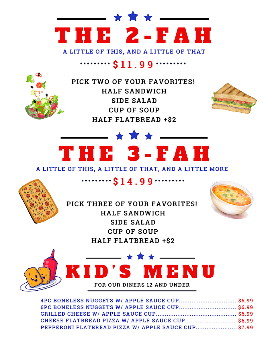 Our stonefired flatbread topped with red tomato sauce, cheddar cheese, mozzarella. feta cheese, and shaved parmesan cheese and baked to golden perfection.