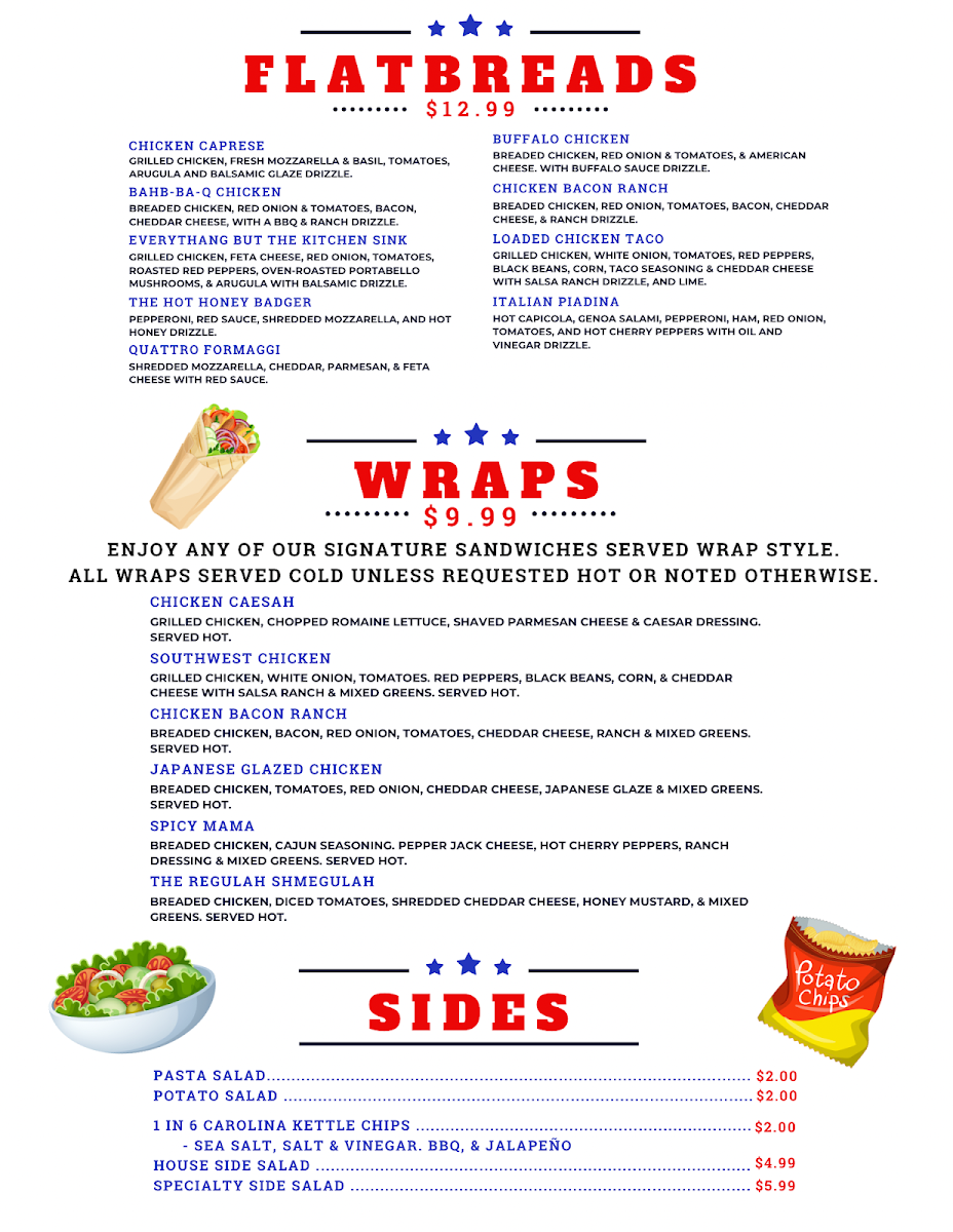Our 12" stonefired flatbread topped with melted American cheese, red onion, tomatoes, and breaded chicken topped with a buffalo sauce and ranch drizzle and then baked to perfection.